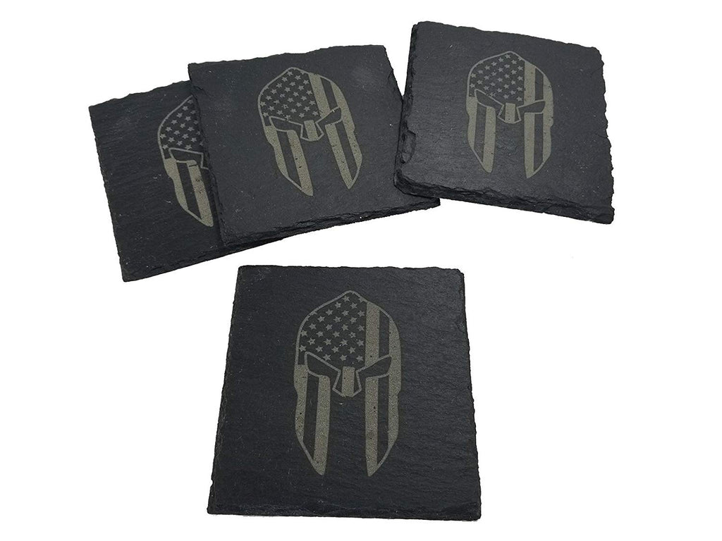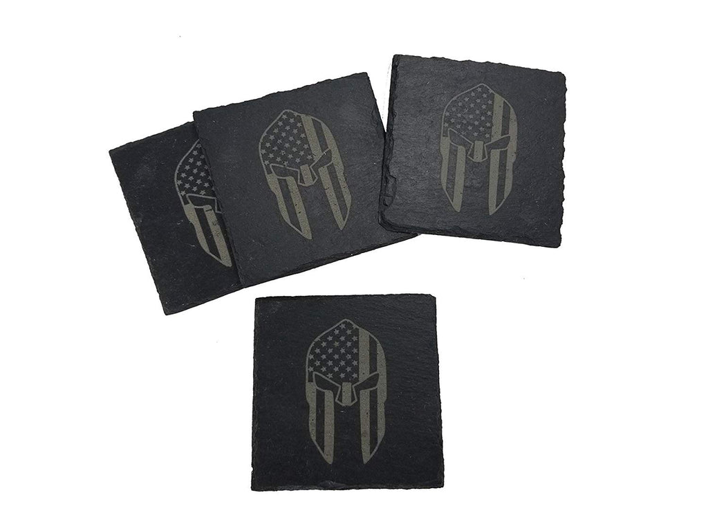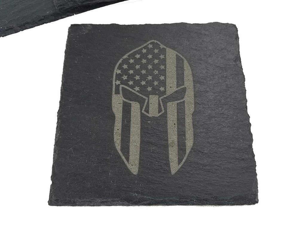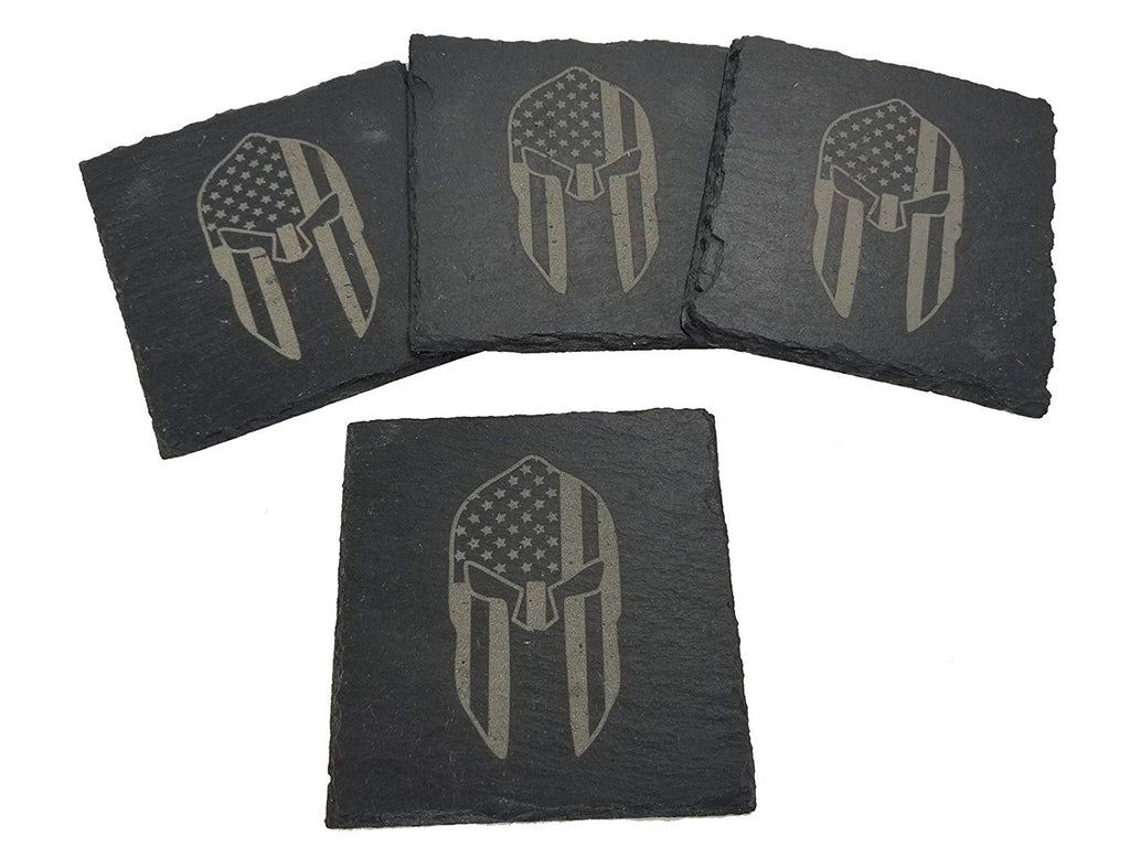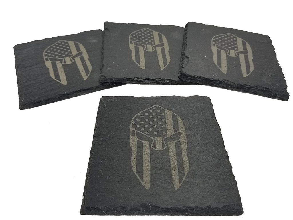 The spartan helmet with the American flag is etched into the natural slate coaster that measures about 4 inches. The rustic nature of the coaster, and rough edges of the slate make it a nice addition to any space.