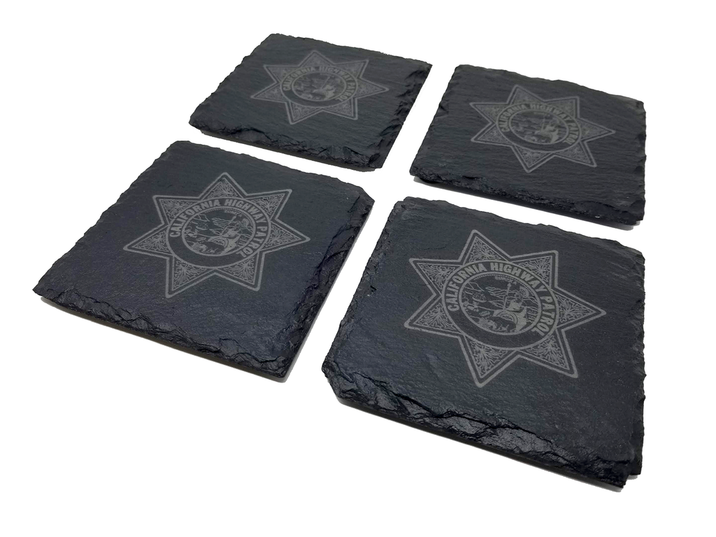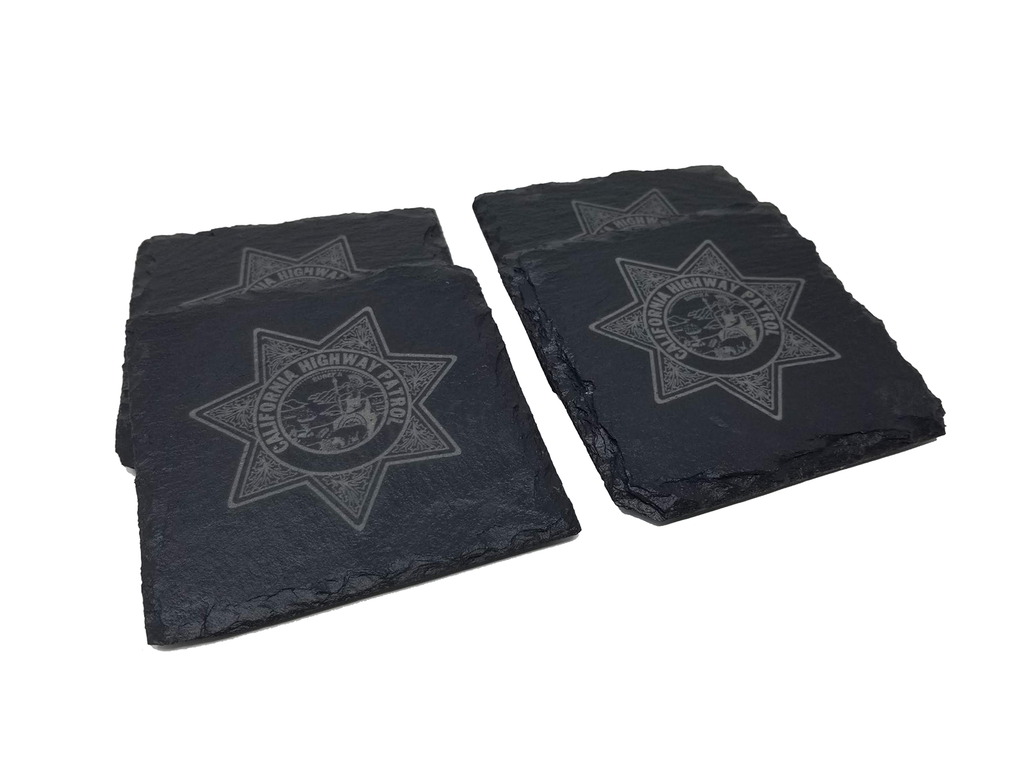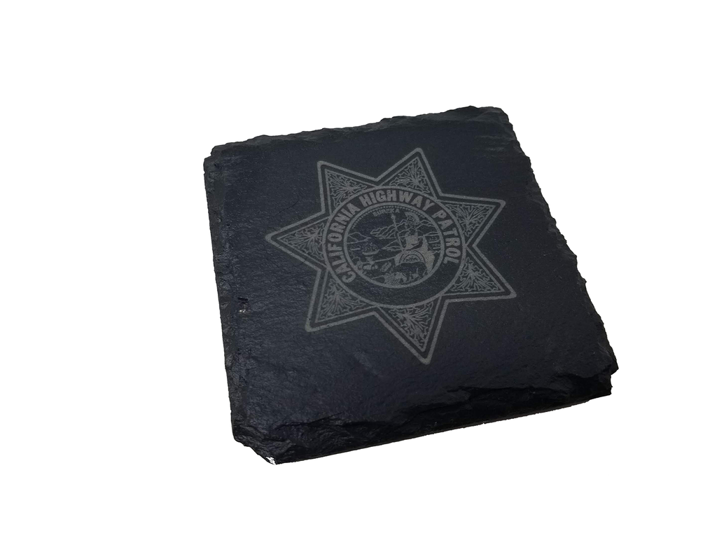 This California Highway Patrol (CHP) coaster set (4) is the perfect gift for an officer or anyone that supports or associated with CHP. The CHP Badge design is etched into the natural slate coaster that measures about 4 inches. Great gift for a new graduate from an academy, promotion, retirement, housewarming or any other occasion.