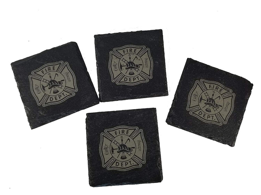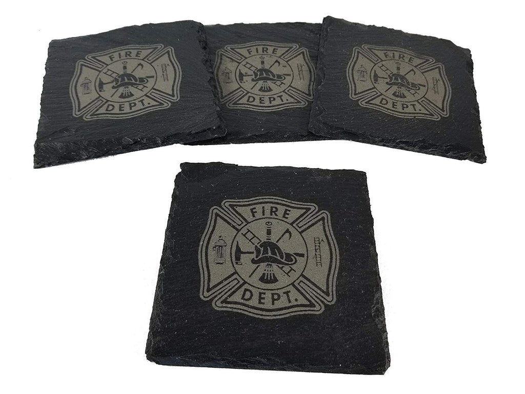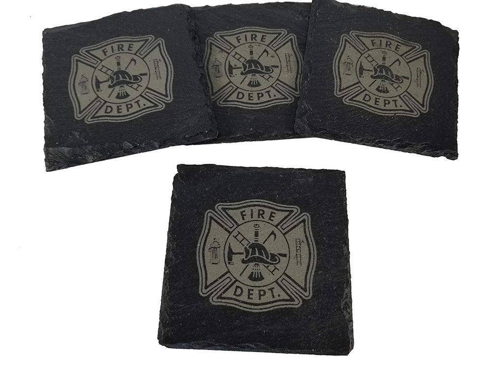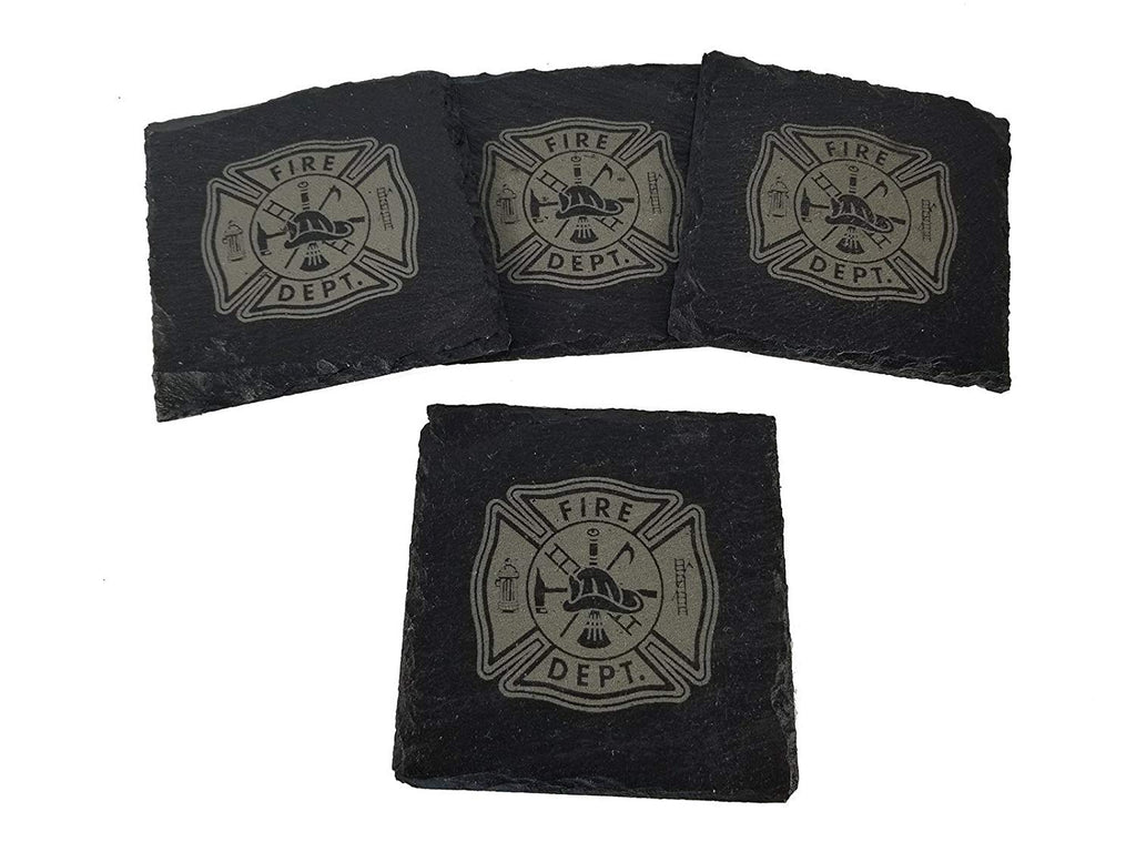 This Fire Dept./firefighter coaster set (4) is perfect gift for a firefighter that enjoys a nice beverage after a long shift. The generic fire department logo is etched into the natural slate coaster that measures about 4 inches. The rustic nature of the coaster, and rough edges of the slate make it a nice addition to any space.
