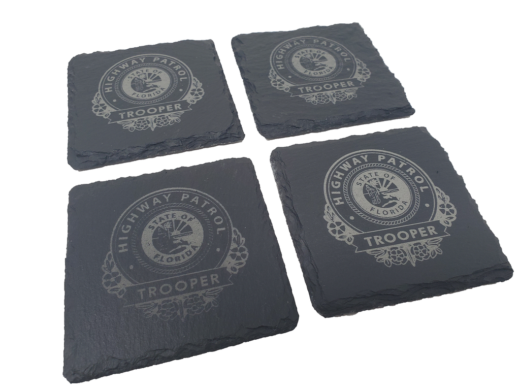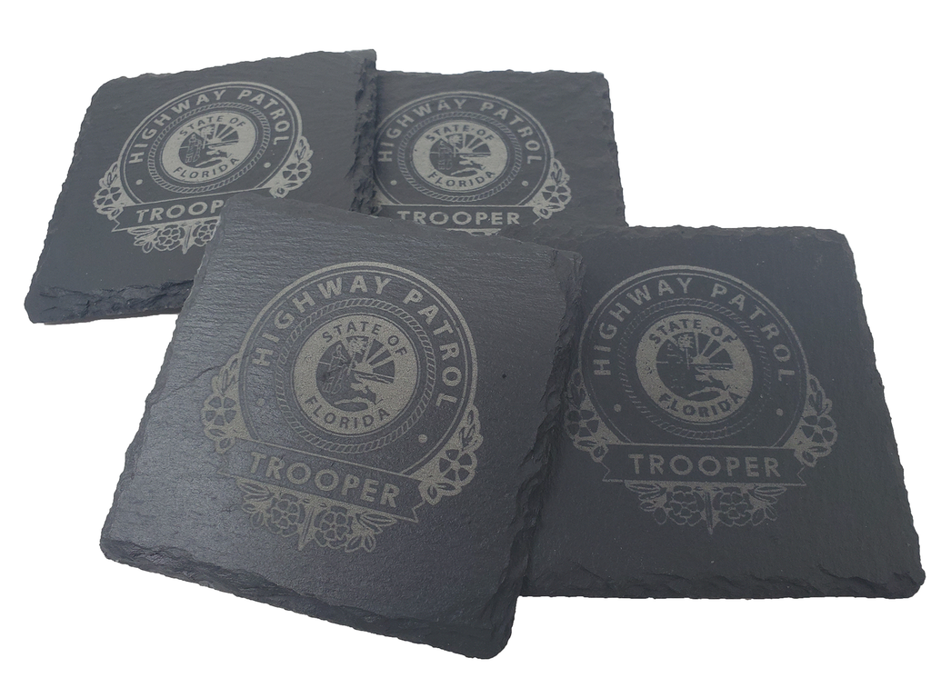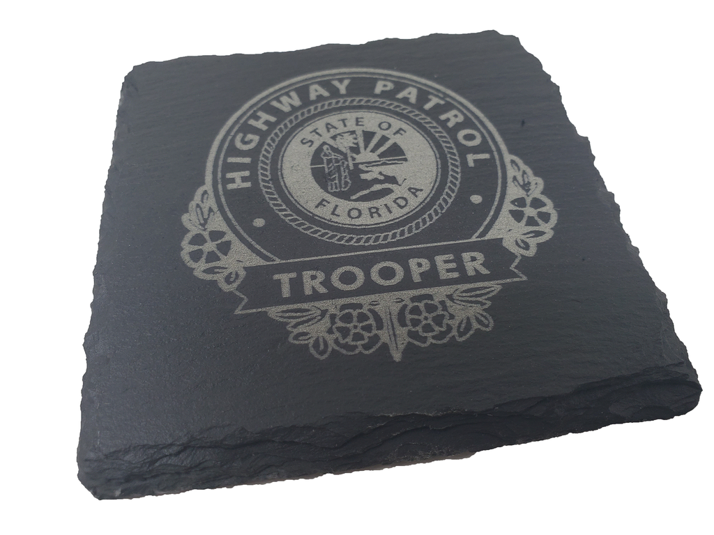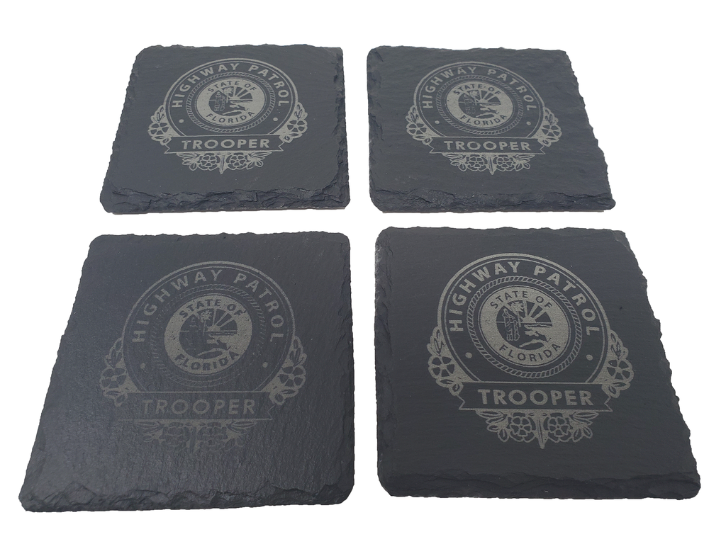 This Florida Highway Patrol coaster set (4) is the perfect gift for a trooper or anyone that supports or associated with FHP. The Florida State Highway Patrol Trooper design is etched into the natural slate coaster that measures about 4 inches. Great gift for a new graduate, promotion, retirement, housewarming, or any other occasion.