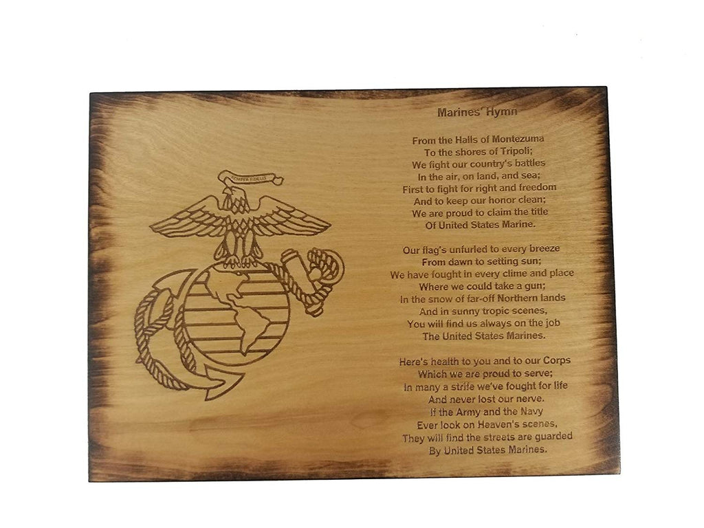 Marines' Hymn - Is the perfect plaque for any proud United States Marine Corps Veteran or a Marine that that is currently serving. The words to the Marine Corps Hymn and image of the Eagle Globe and Anchor are engraved into the piece of plywood. The sign has the edges burned to give it a nice rustic/aged/"forged by fire" look and finished with an oak stain to protect it. Each piece may vary slightly in color and wood grain. The back has a saw-tooth hanger for easy wall hanging.