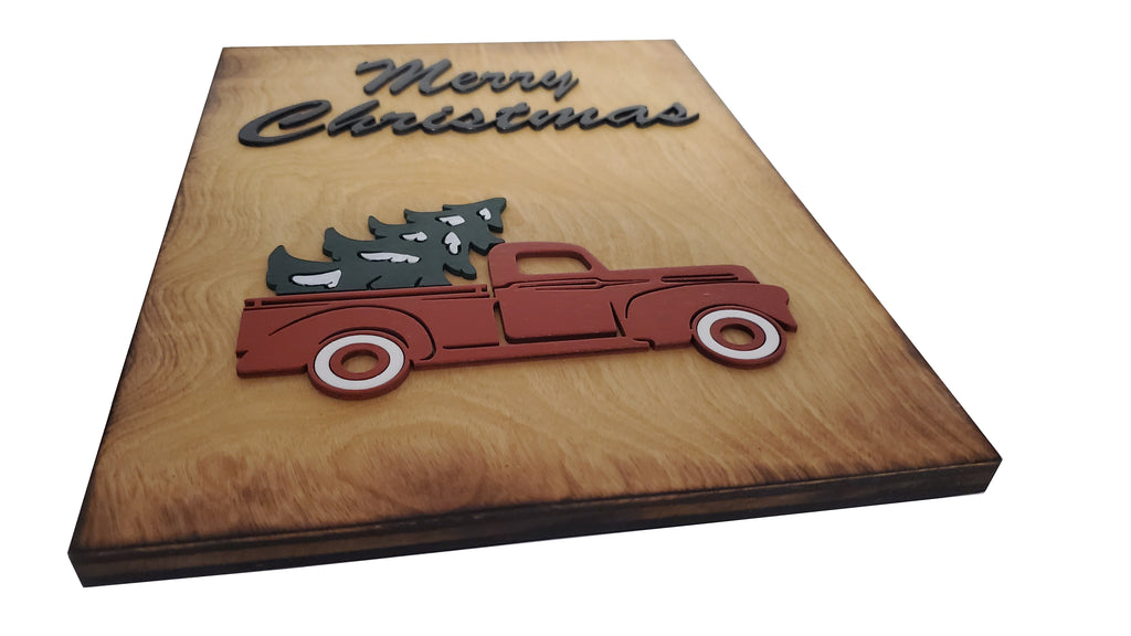 Add a little Christmas decor to any room with this blue/red truck sign. The sign base is made of cabinet grade plywood and stained with an oak stain. The scorched edges give it a nice rustic feeling. The words "Merry Christmas", the truck and tree are cut out of wood and attached to the wood backing.