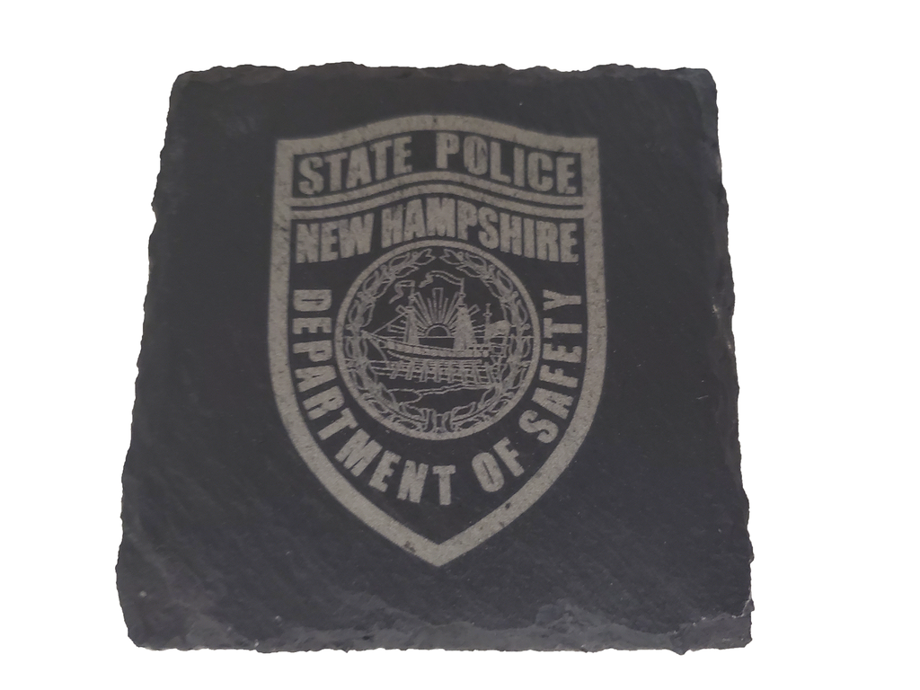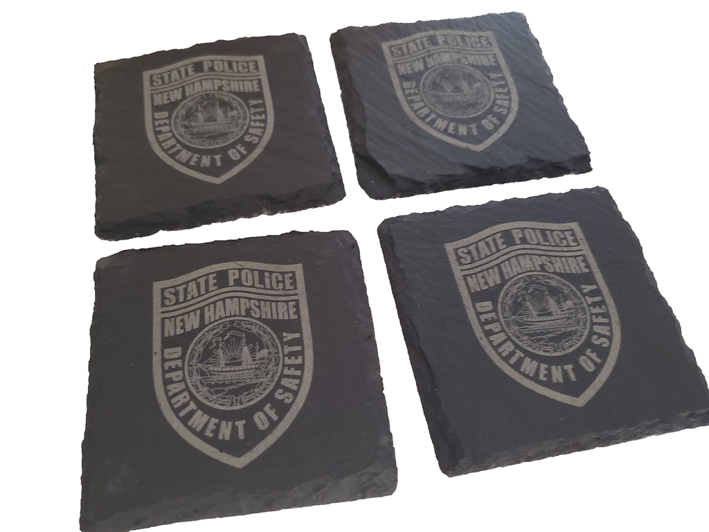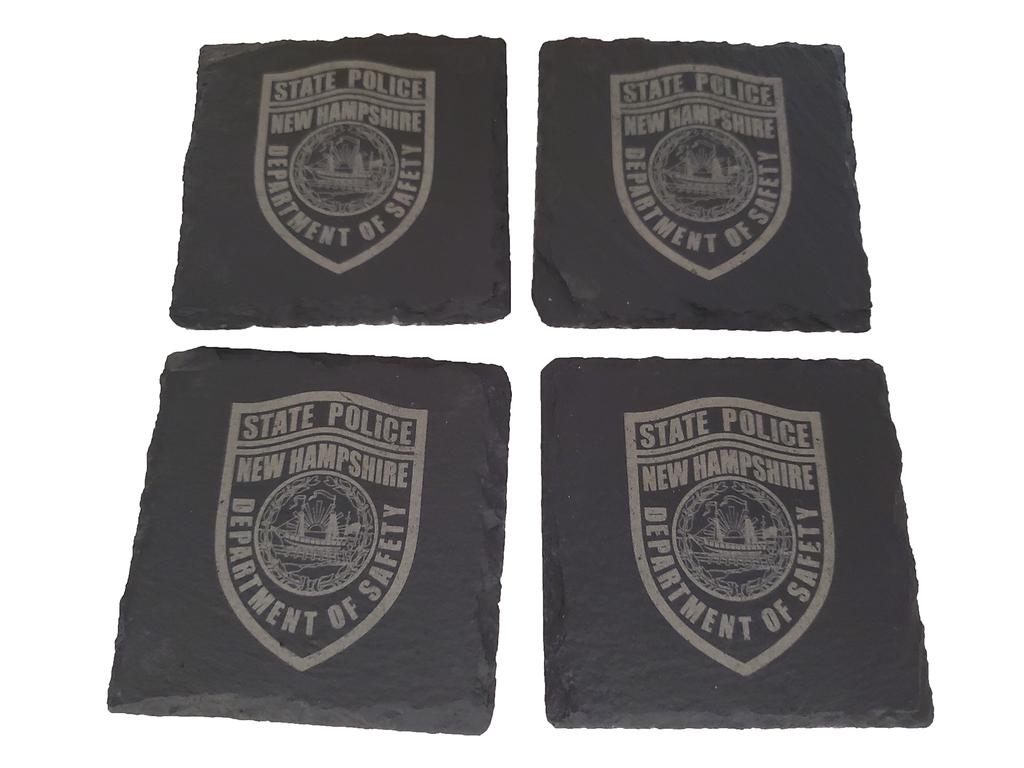 This New Hampshire State Police coaster set (4) is the perfect gift for a trooper or anyone that supports or associated with NHSP. The New Hampshire Trooper design is etched into the natural slate coaster that measures about 4 inches.  Great gift for a new graduate from an academy, promotion, retirement, housewarming, or any other occasion.