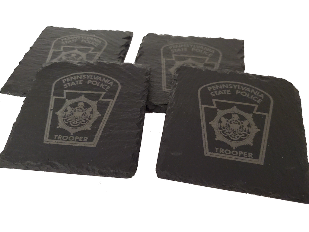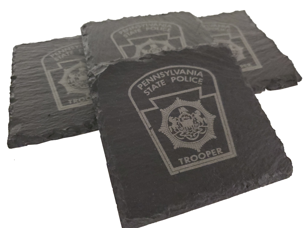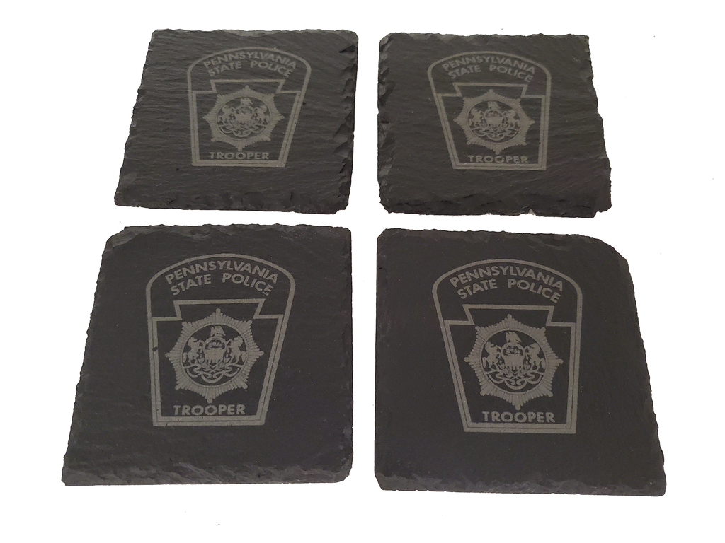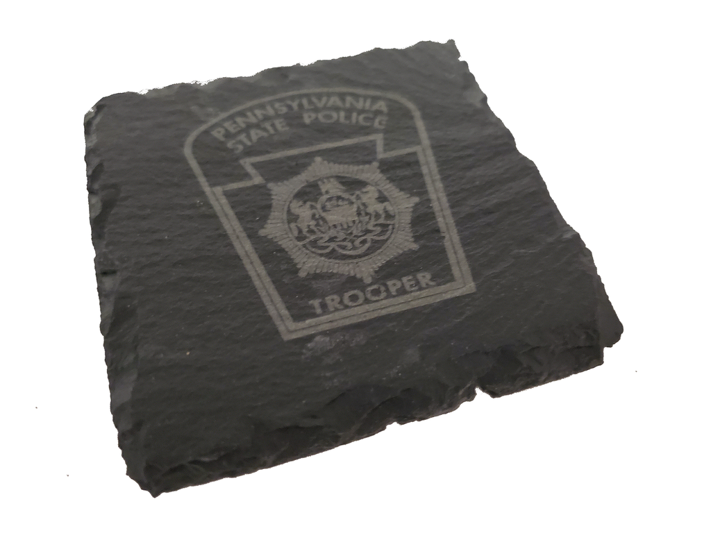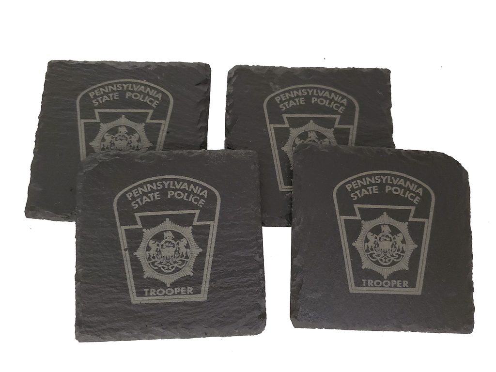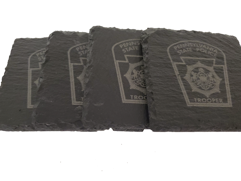 This Pennsylvania State Police slate coaster set (4) is the perfect gift for a trooper or anyone that supports or associated with PA State Police. The Pennsylvania state police design is etched into the natural slate coaster that measures about 4 inches.  Great gift for a new graduate from the academy, promotion, retirement, housewarming or any other occasion.