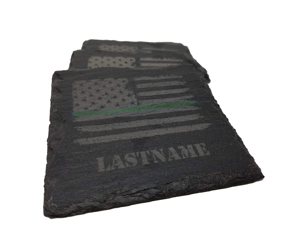 This personalized Green Line Distressed American flag coaster set (4) is the perfect gift for a border patrol agent, park ranger, serving in the military or federal law enforcement agent. The flag and last name are etched into the natural slate coaster that measures about 4 inches. The green line is hand-painted to match the rustic nature of the coaster, the distressed flag and the rough edges of the slate. Great gift for anyone in federal law enforcement as a new graduate from an academy, promotion, retirement, housewarming or any other occasion.