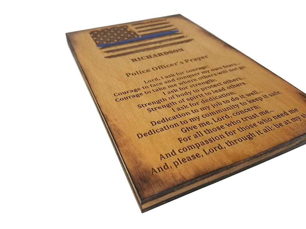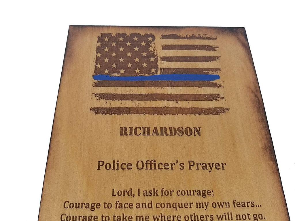 This personalized police prayer sign would make a nice gift for a police officer that is graduating from a police academy. A distressed American flag, a Police Officer's Prayer, and the last name are etched into the piece of plywood. A blue line is hand painted on the flag to represent the man and women of law enforcement. The edges of the sign are scorched to give it a nice rustic/aged/"forged by fire" look. The sign is finished with an oak stain and clear coat. Each piece will vary slightly in color, wood grain and the way the edges are scorched. The back has a saw-tooth hanger for easy wall hanging.
