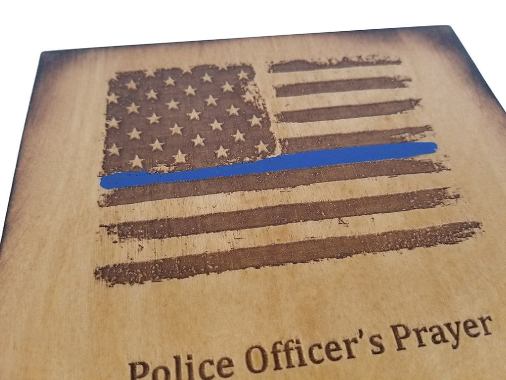 This sign would make a nice gift for a police officer that is graduating from a police academy. A distressed American flag along with a Police Officer's Prayer are etched into the piece of plywood. A blue line is hand painted on the flag to represent the man and women of law enforcement. The edges of the sign are scorched to give it a nice rustic/aged/"forged by fire" look. The sign is finished with an oak stain and clear coat. Each piece will vary slightly in color, wood grain and the way the edges are scorched. The back has a saw-tooth hanger for easy wall hanging.