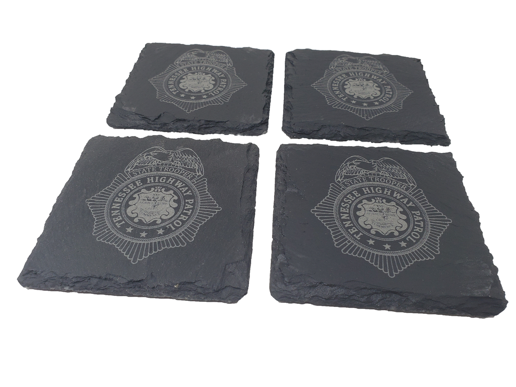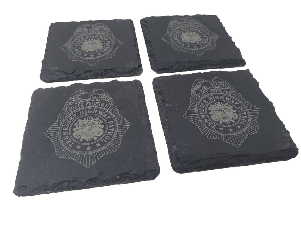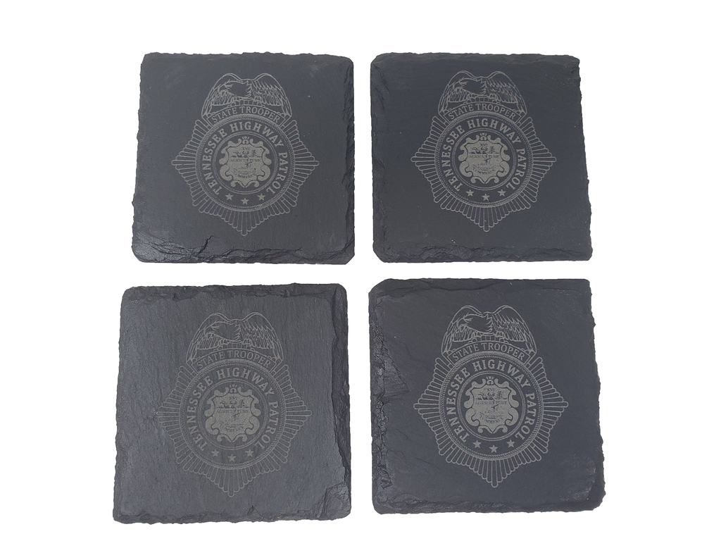 This Tennessee Highway Patrol slate coaster set (4) is the perfect gift for a trooper or anyone that supports or associated with the Tennessee Highway Patrol (THP). The Tennessee Trooper badge design is etched into the natural slate coaster that measures about 4 inches. Great gift for a new graduate from the academy, promotion, retirement, housewarming, or any other occasion.