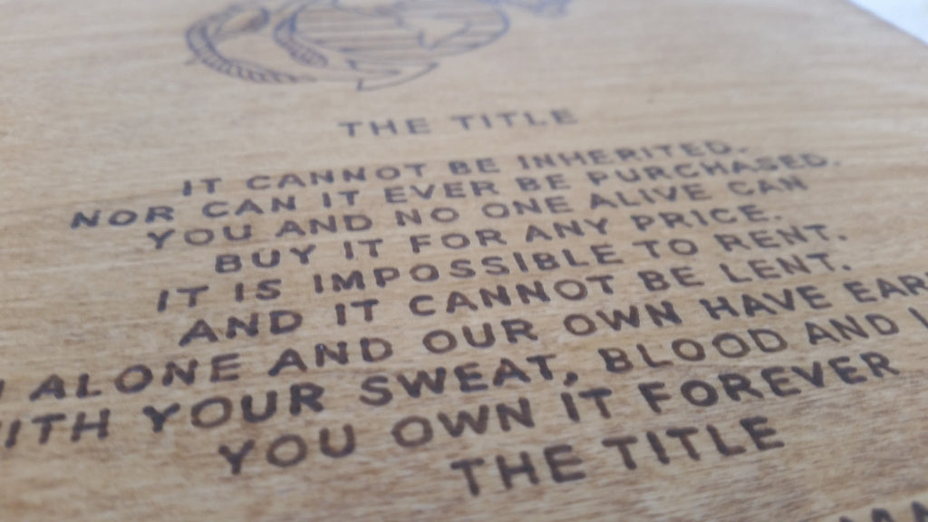 "The Title - United States Marine" keepsake box makes for a perfect boot camp graduation gift. The box has the Eagle Globe and Anchor (EGA) and the poem "The Title" burned into the top of the wood box by hand. The edges of the box are burned to give it a nice rustic/aged look and finished with an oak stain. The inside top and bottom of the box are lined with red felt.