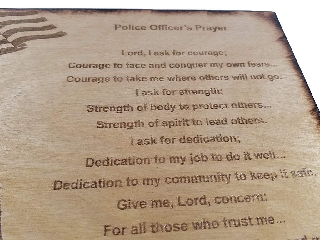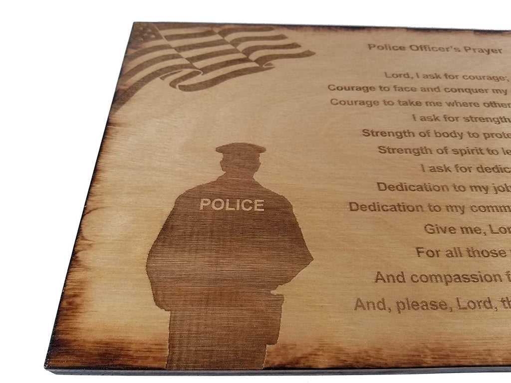 The Police Officer Prayer sign has an American Flag and a police silhouette. The American flag along with the Police Officer's Prayer are etched/engraved into the plywood. The sign has the edges burned to give it a nice rustic/aged/"forged by fire" look and finished with an oak stain to protect it. Each piece may vary slightly in color and wood grain. The back has a saw-tooth hanger for easy mounting.