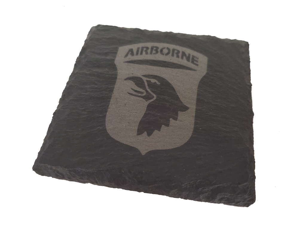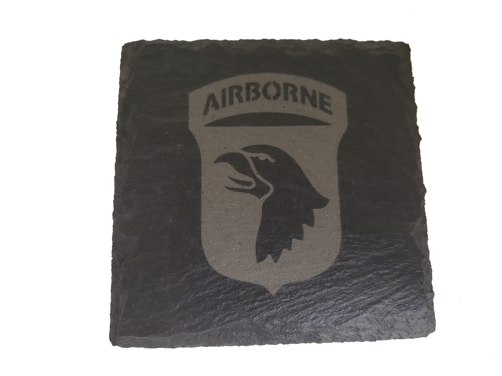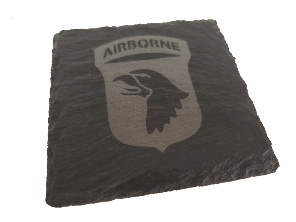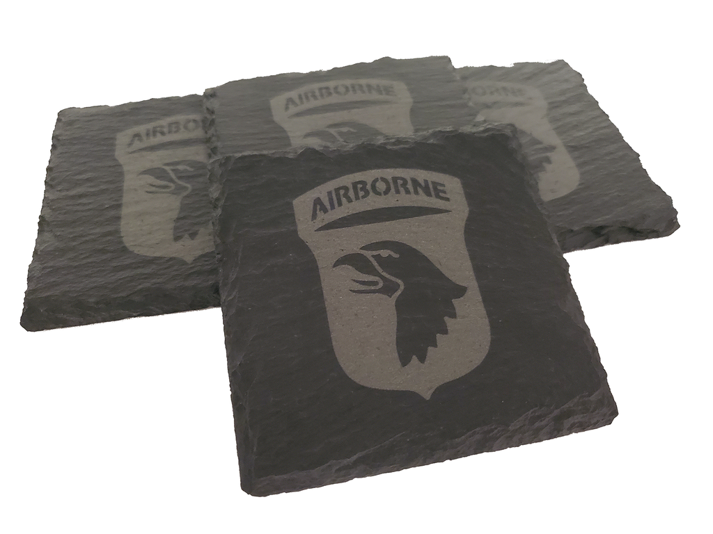 This 101st Airborne coaster set (4) is the perfect gift for someone serving in the 101st Airborne Division. The design is etched into the natural slate coaster that measures about 4 inches. Great gift for a veteran or a new member of the 101st as well as other occasions such as promotion, retirement, or housewarming.-Set includes 4 coasters
