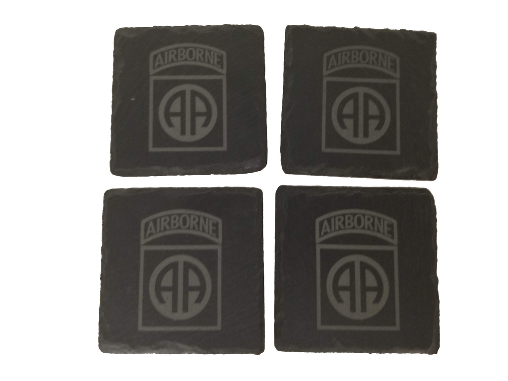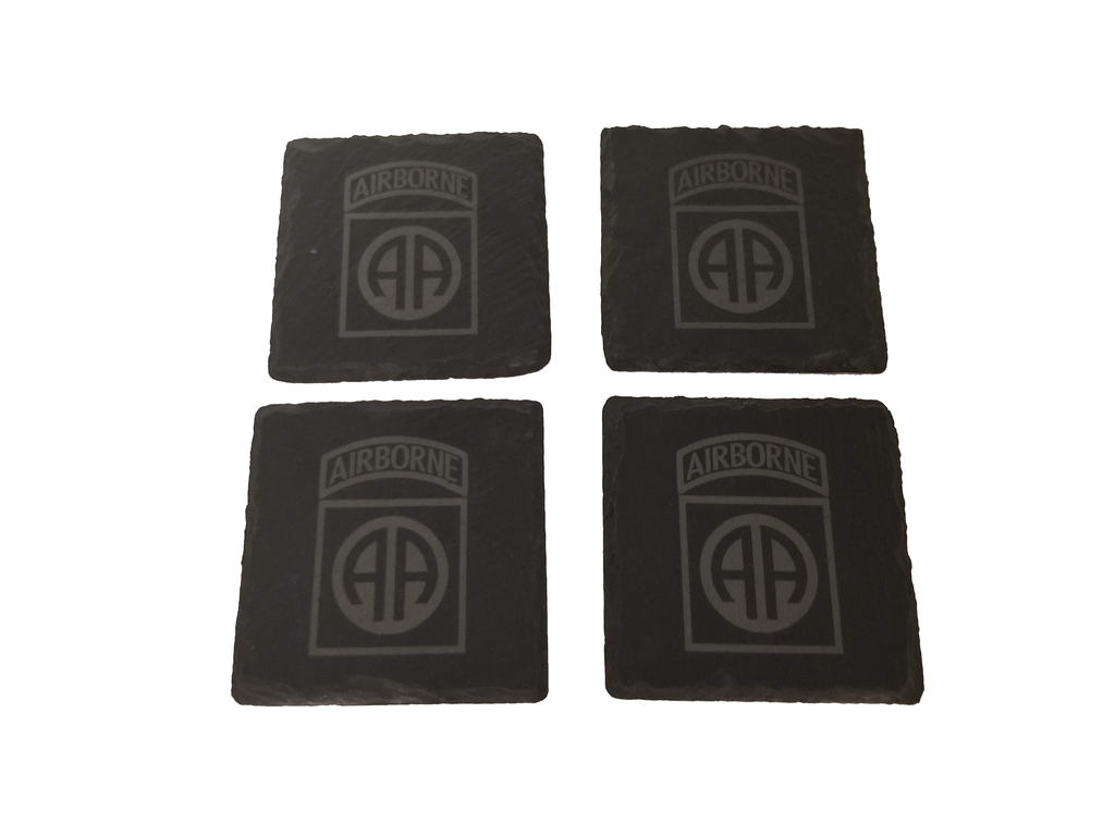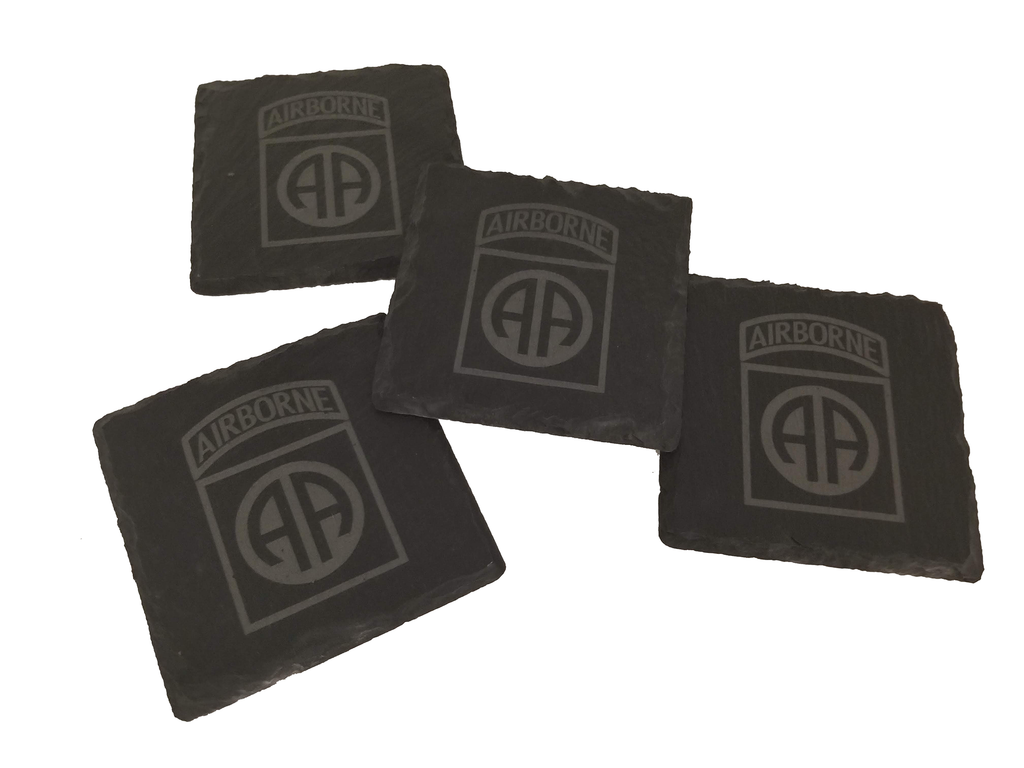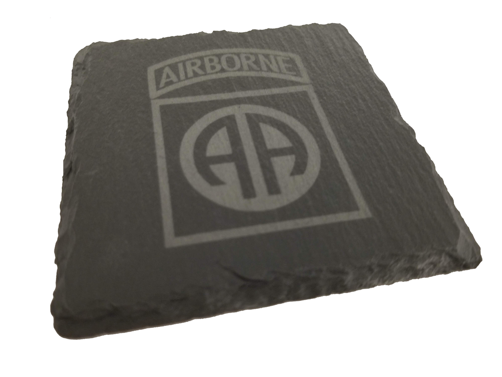 This 82nd Airborne coaster set (4) is the perfect gift for someone serving in the 82nd Airborne Division. The design is etched into the natural slate coaster that measures about 4 inches. Great gift for a veteran or a new member of the 82nd as well as other occasions such as promotion, retirement, or housewarming.-Set includes 4 coasters